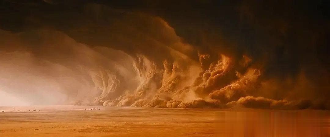 在逃脱城市之前或之后,主角们不可避免的会面对世界末日之后的标配场景,那便是无边的沙漠。《疯狂的麦克斯》从1拍到4都是围绕这一不变的末世景象。只是在第4集里才展示了一次新噱头——沙漠中的雷暴,这也是《疯狂的麦克斯:狂暴之路》中最吸引眼球的一段视效奇观。